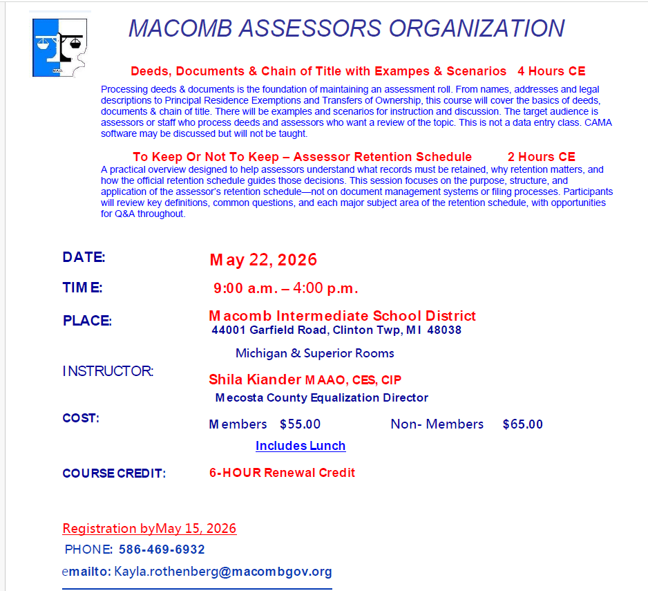 March 19, 2026 macombassessorsorganization Deeds, Documents & Chain of Title To Keep or Not to Keep- Assessor Retention Schedule Share this: Share on X (Opens in new window) X Share on Facebook (Opens in new window) Facebook Related